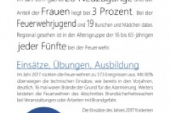 Bei den 573 Einsätzen des Jahres 2017 überwogen technische Einsätze mit etwa 90%. Darunter fielen vor allem Ausrückungen bei extremen Wettersituationen, Überflutungen, Verkehrsunfällen oder Wassertransporten. Brandeinsätze sind glücklicherweise seit vielen Jahren rückläufig, schlagen dennoch mit 16 Alarmierungen zu Buche. Brandsicherheitswachen machen den Rest aus. Zusammengefasst leisten die ‚Florianijünger‘ mehr als 15.000 freiwillige Stunden für Einsätze, Übungen und Weiterbildungen.