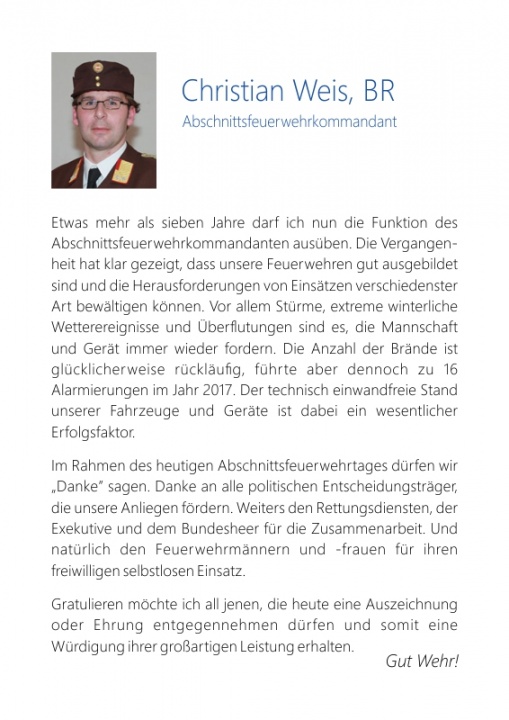 Vizebürgermeister Karl Eichinger erwähnte, dass das freiwillige Engagement besonders zu würdigen ist und man seitens der Gemeinden auch in Zukunft auf die Hilfe der Einsatzkräfte zählen wird. Aus seinen Erfahrungen konnte Bezirkshauptmann Michael Widermann berichten, dass andere Nationen Österreich um die Aufstellung der freiwilligen Einsatzkräfte beneiden. Eine flächendeckende Sicherstellung der Hilfe bei Katastrophen ist in manchen benachbarten Ländern keineswegs selbstverständlich. Für Bundesrätin Andrea Wagner steht die Abkürzung FF für ‚Faszination Feuerwehr‘ und sie sieht den Abschnittsfeuerwehrtag als würdigen Rahmen, die Leistungen langgedienter Mitglieder zu honorieren. Nationalratsabgeordnete Angela Fichtinger und Abgeordneter des Landtages Franz Mold sind froh, dass das Feuerwehrwesen gut funktioniert. Neben der Aufrechterhaltung der Einsatzbereitschaft tragen die Feuerwehren aktiv zum Dorfleben bei.
